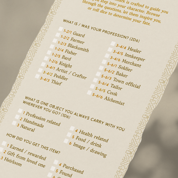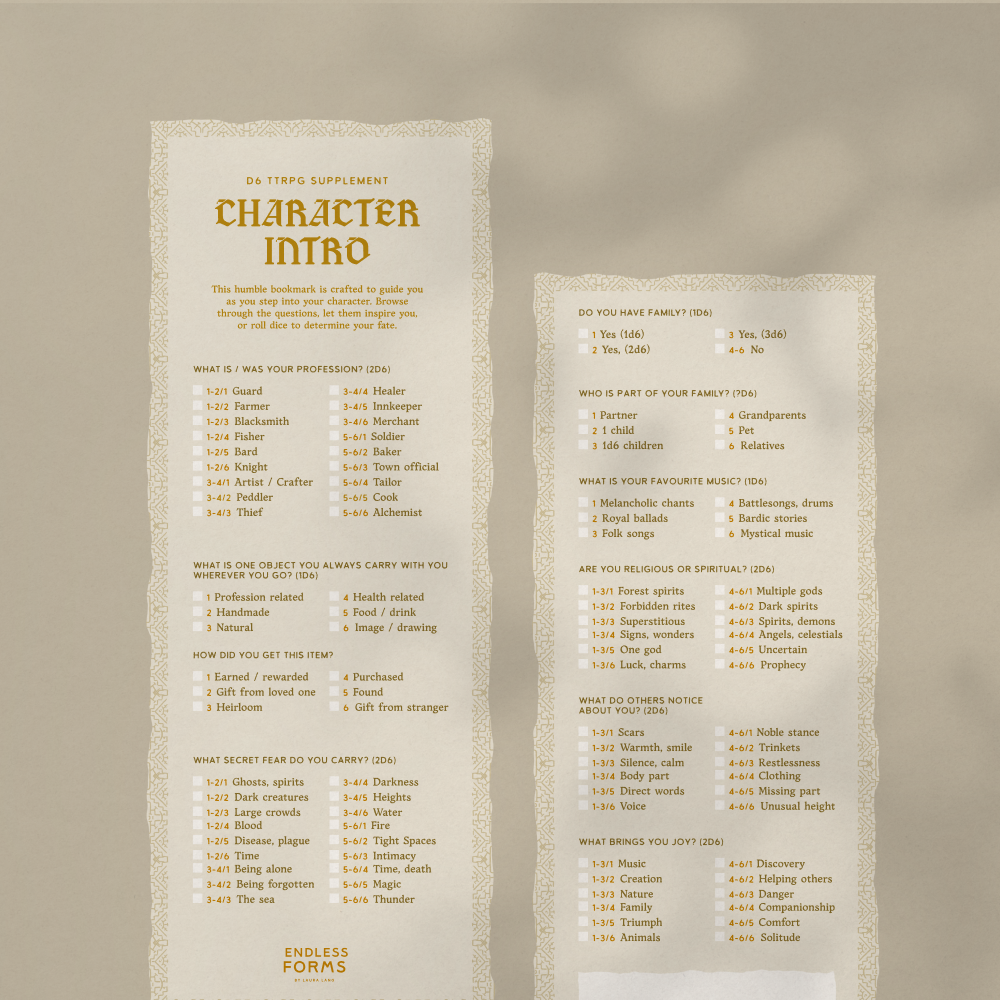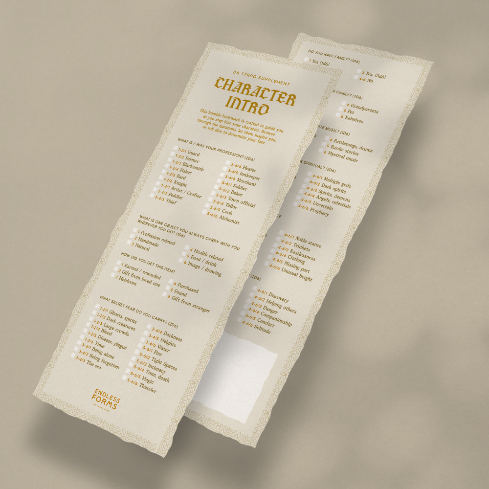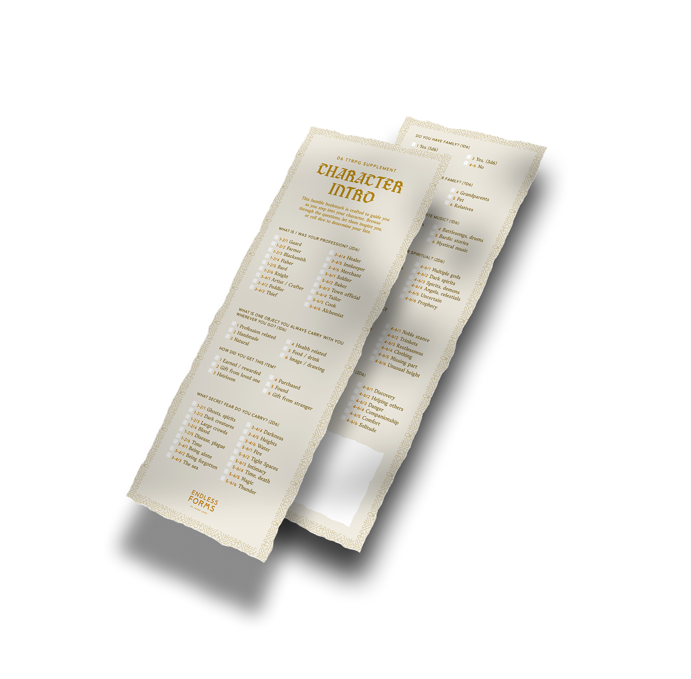 This humble bookmark is crafted to guide you as you step into your character. Browse through the questions, let them inspire you, or roll dice to determine your fate. Use it for your first multiplayer session or deepen your character creation in solo games.