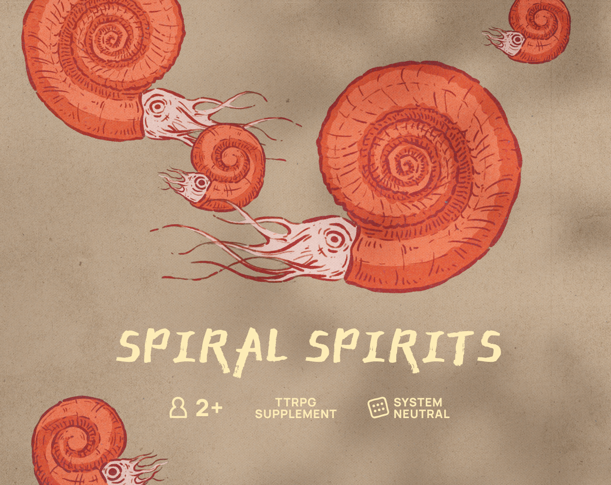 5 unique ammonite spirits, inspired by real ammonites, each with a narrative and example challenge. Illustrated cards to print for tabletop setups or show on VTT setups, and additional inspiration to increase the challenges.