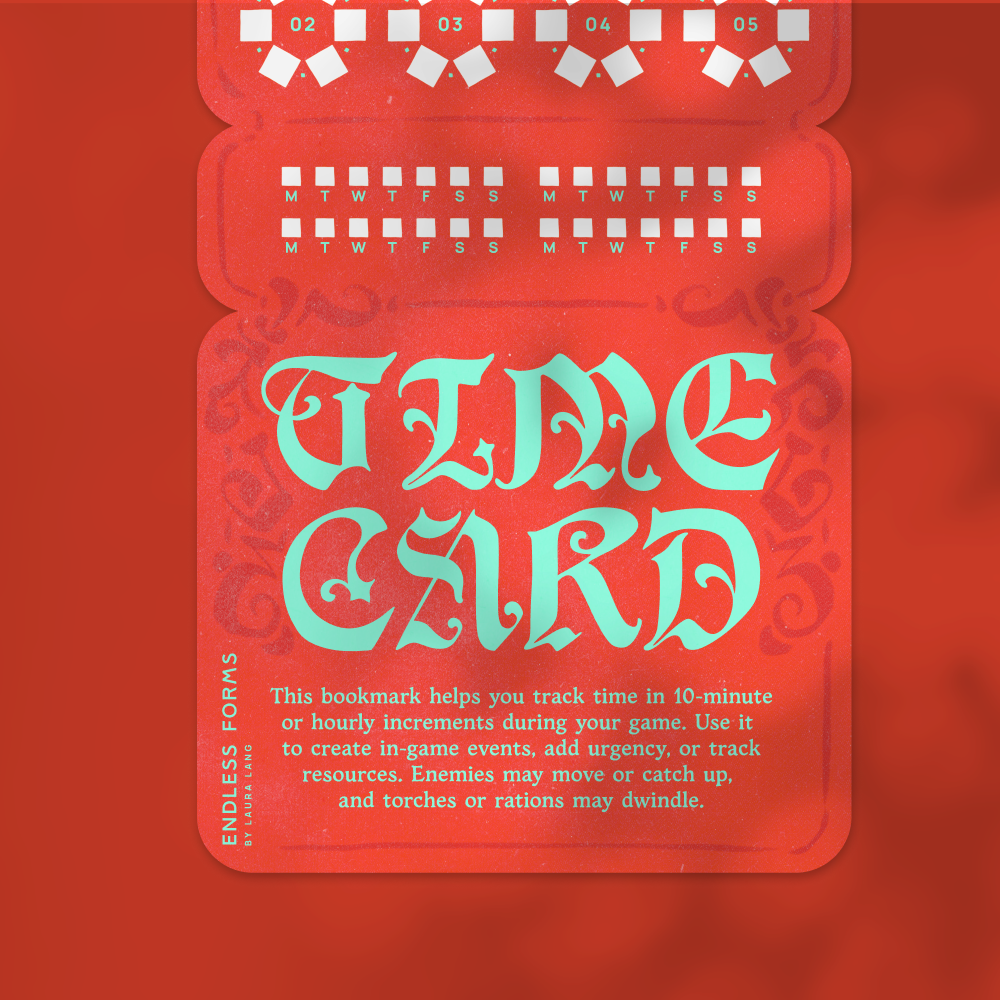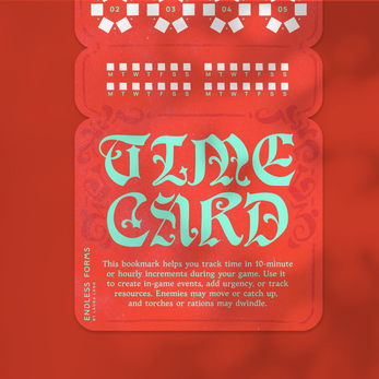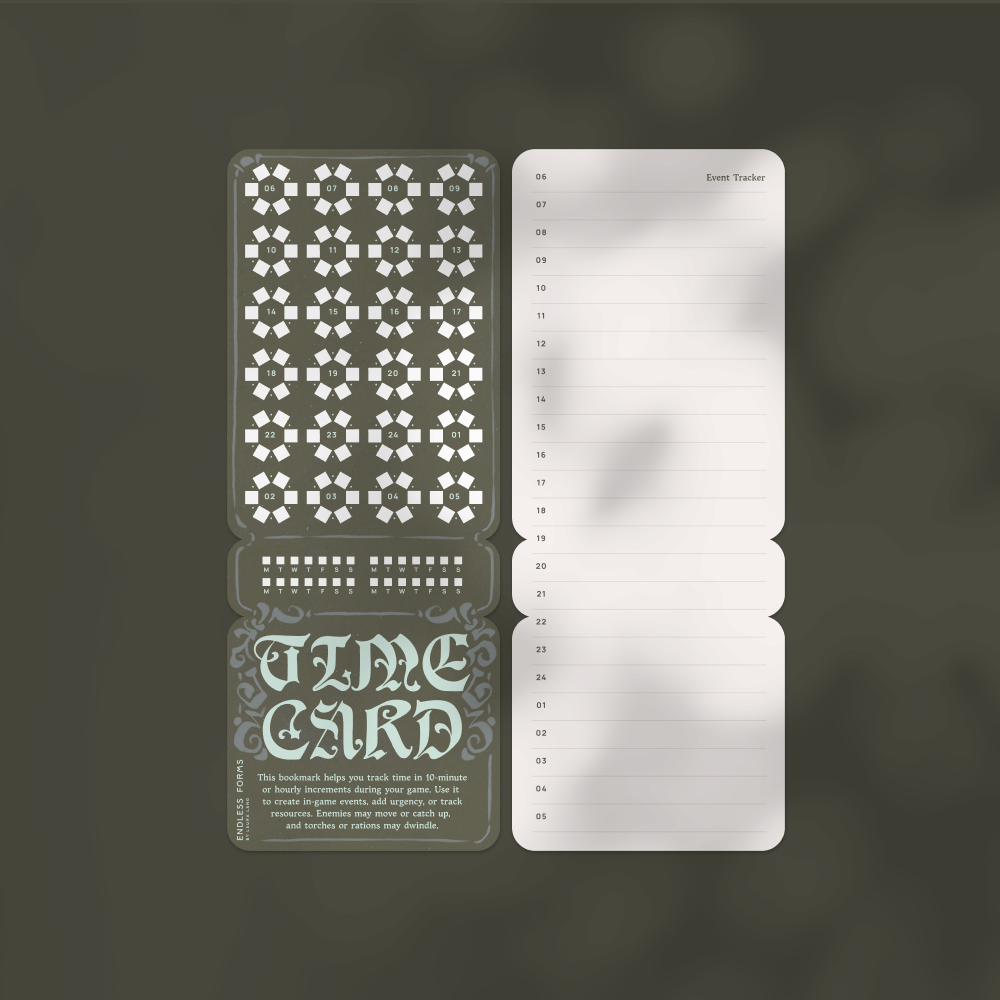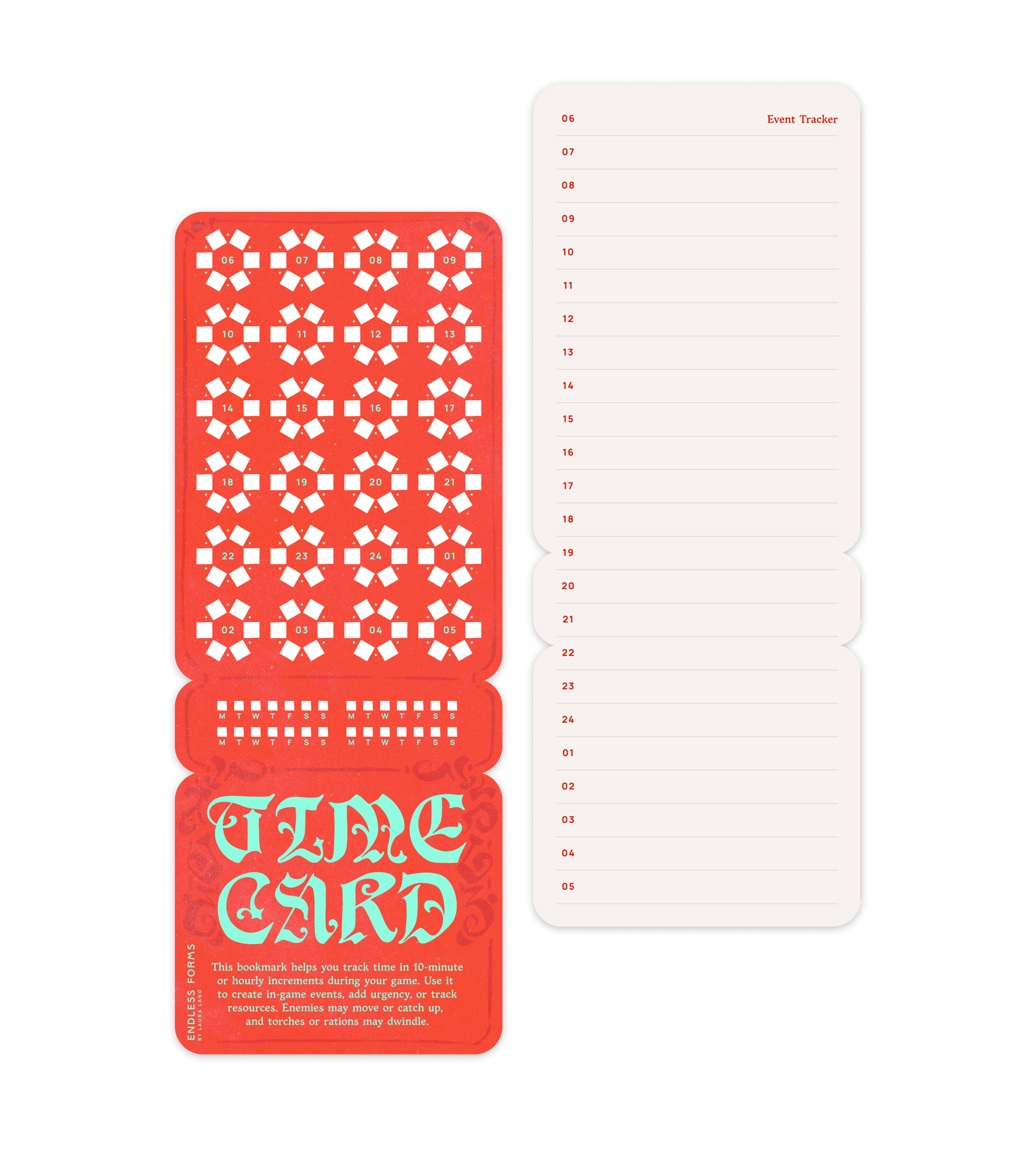 This bookmark helps you track time in 10-minute or hourly increments during your game. Use it to create in-game events, add urgency, or track resources. Enemies may move or catch up, and torches or rations may dwindle.